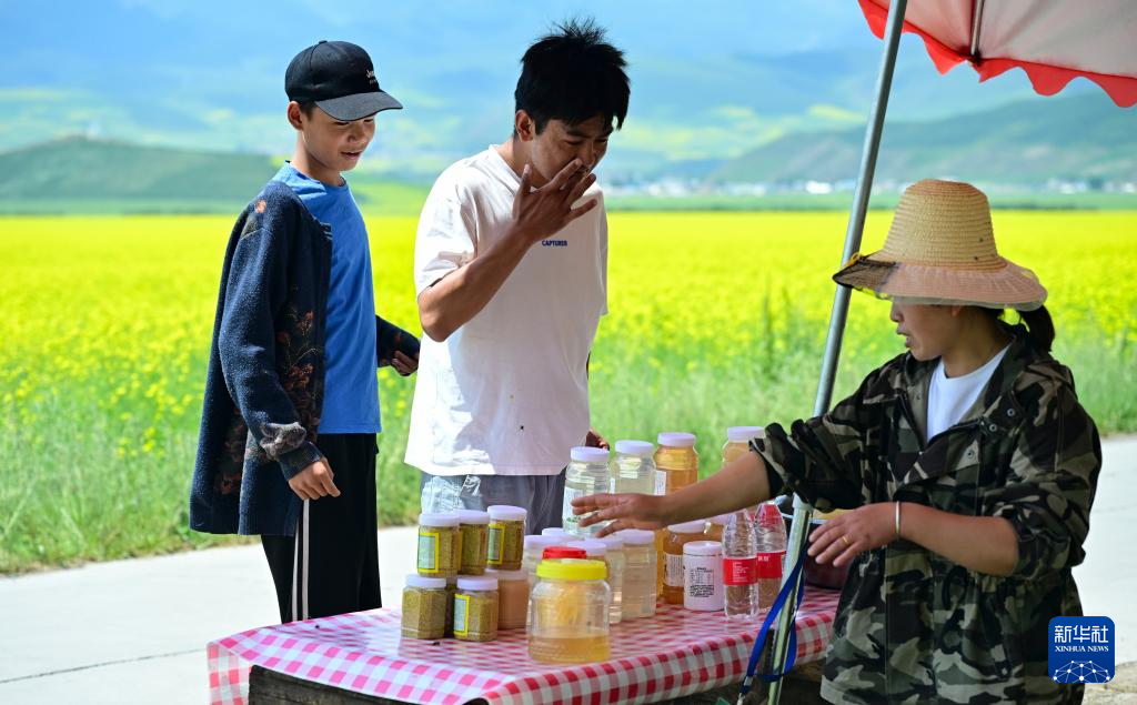 7月16日,在青海省海北藏族自治州门源回族自治县,游客在吴凤明家蜂蜜摊前品尝蜂蜜。新华社记者 齐芷玥 摄