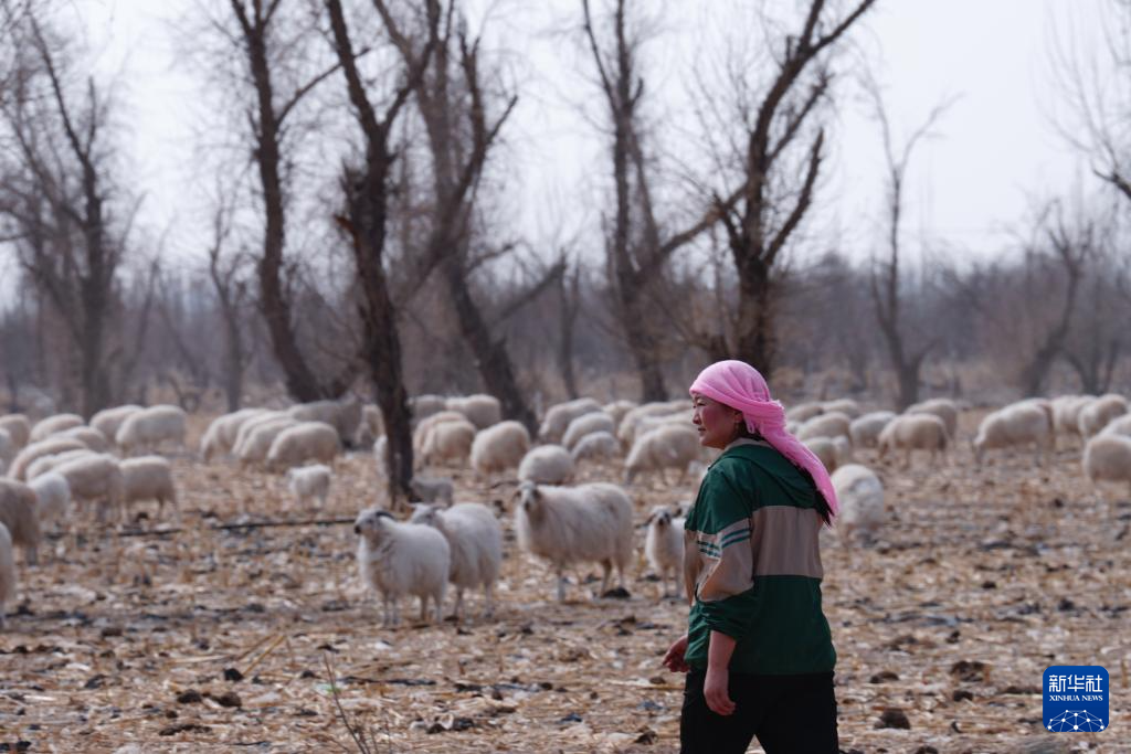 3月7日,在甘肃省张掖市甘州区碱滩镇二坝村的借牧点,东宝的儿媳拉中在放牧。新华社记者 张龙 摄