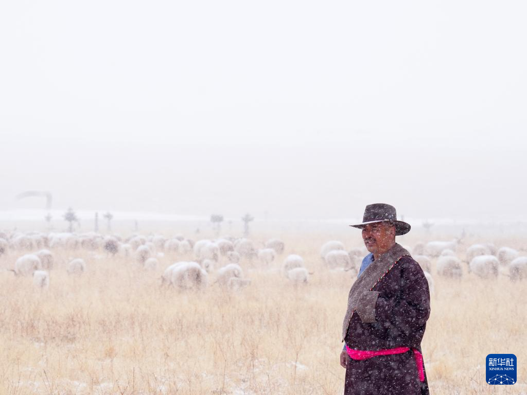 3月8日,在青海省海北藏族自治州祁连县阿柔乡草大板村,牧民东宝在草原上放牧。新华社记者 张龙 摄